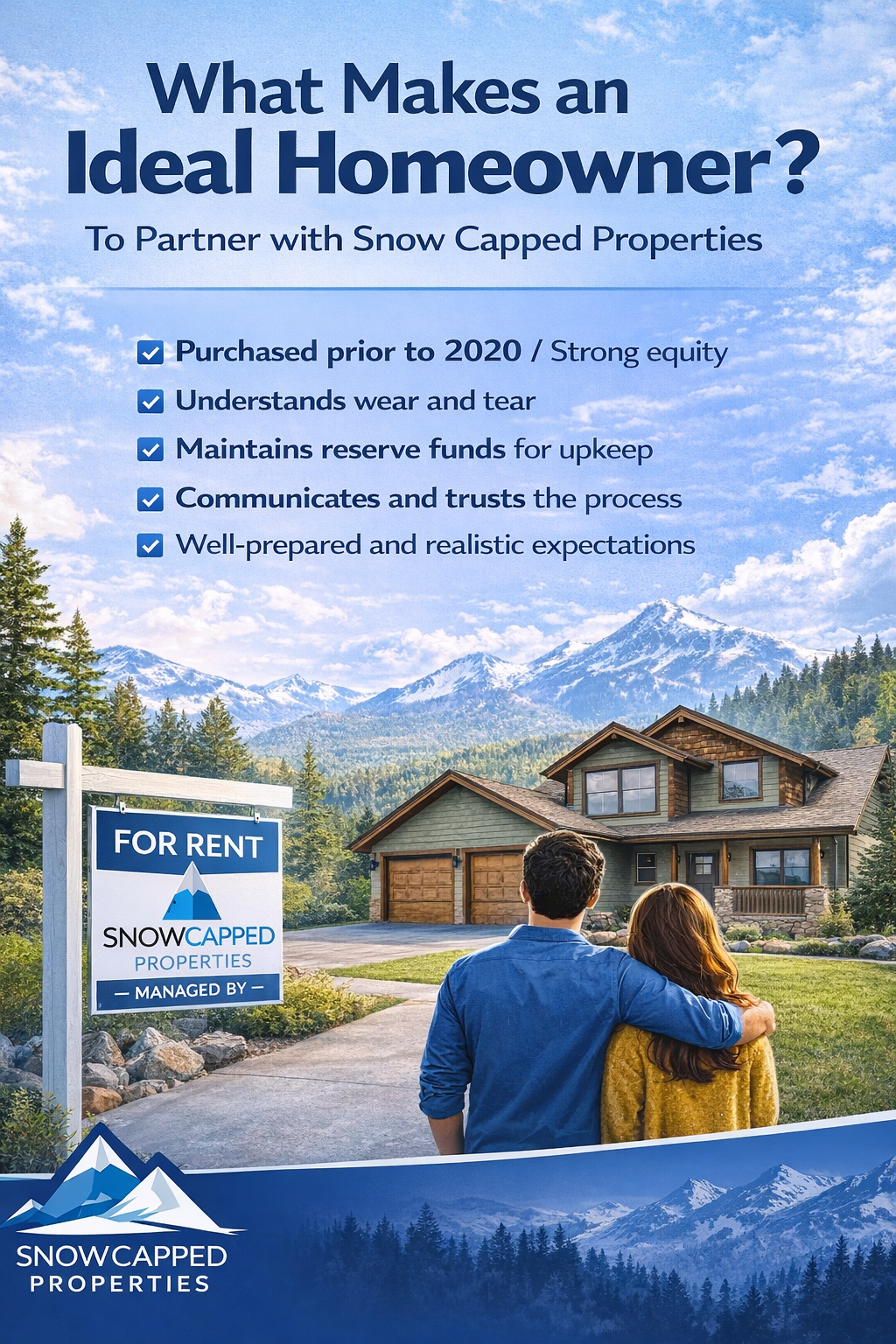 At Snow Capped Properties, we believe in achieving your rental goals—TOGETHER. From proactive maintenance and prompt issue resolution to meticulous tenant screening, we handle every detail with care and expertise. Our secure, hassle-free rent collection system ensures timely payments, while our streamlined processes keep your property in top condition. With us, you can expect a smooth, stress-free rental experience that benefits owners, tenants, and the entire community!